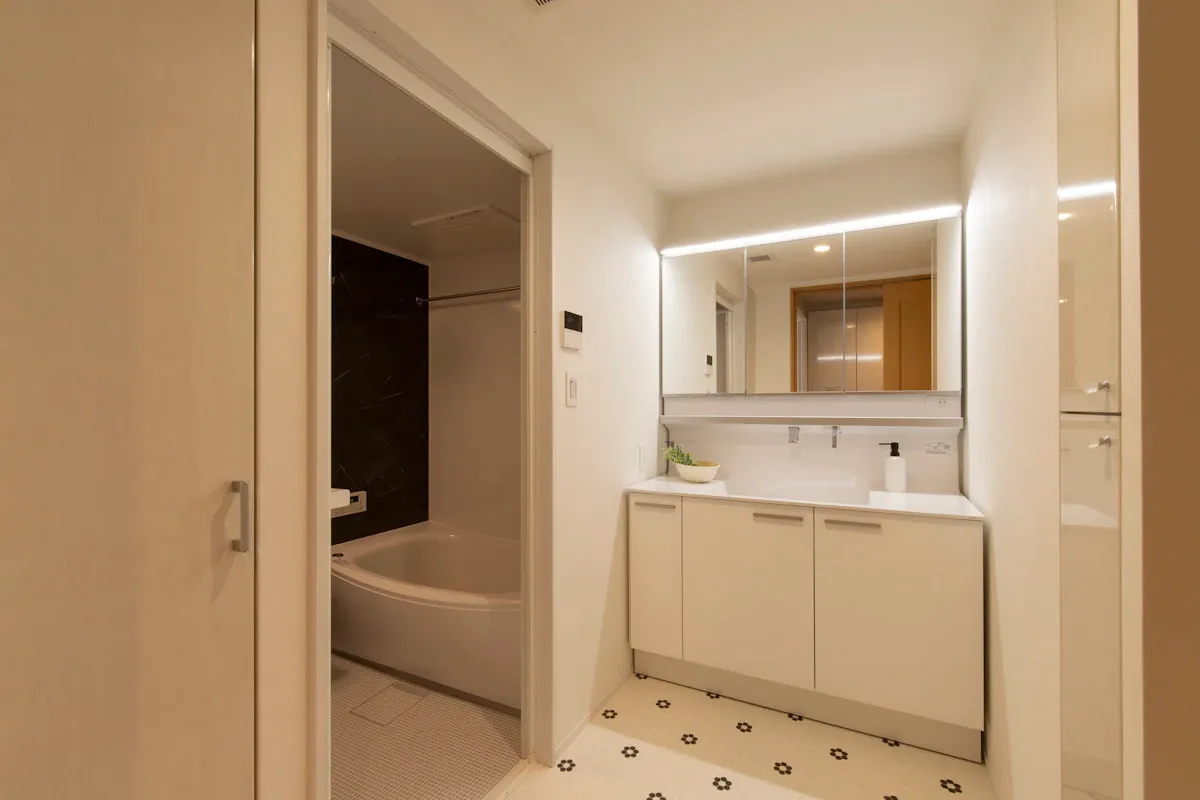 ワイドな洗面化粧台を設置。鏡を開けると収納になっていて、家族の日用品がたっぷりと収納できます。