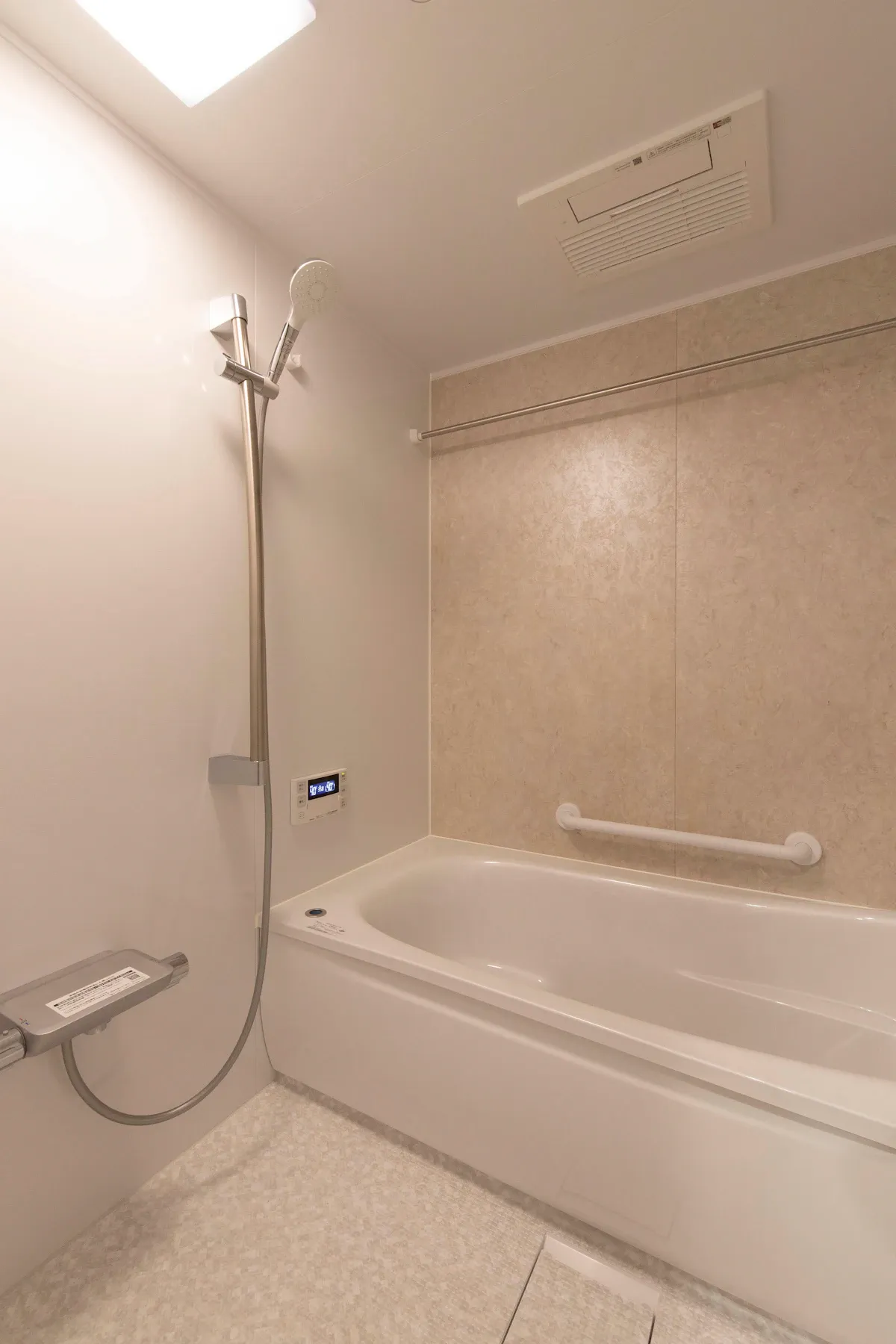 浴室はワンサイズアップし、お子様と一緒にお風呂がはいっていただける広さに。壁にはマグネットがくっつくシステムバスを採用しています。